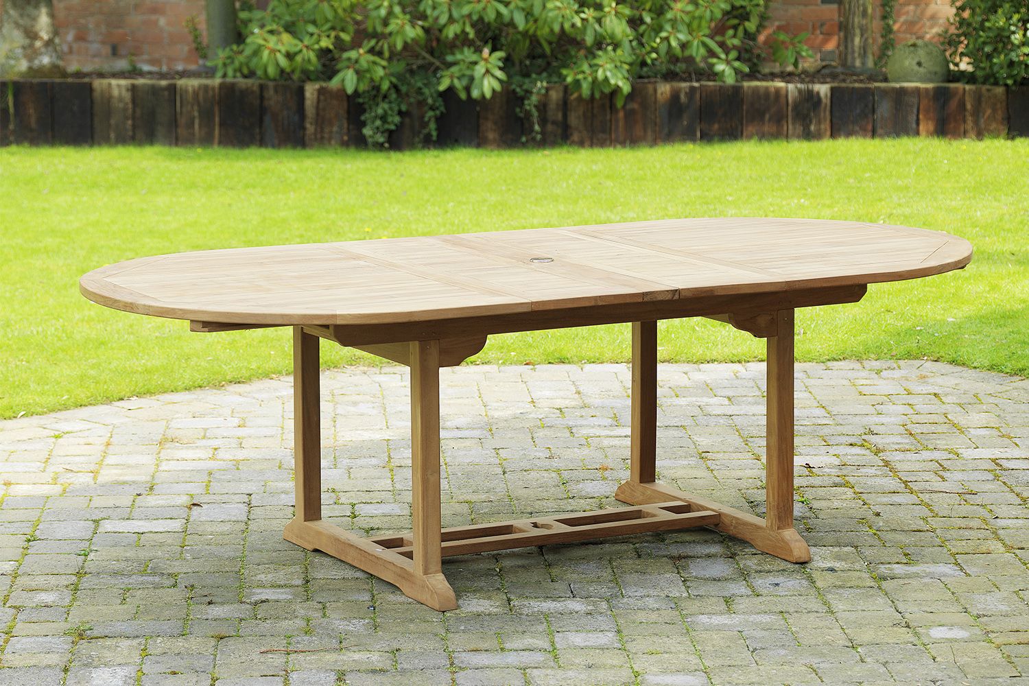 The Brompton Oval 10-Seater Outdoor Teak Garden Patio Dining Set by Sloane & Sons. Crafted from Grade A teak, this beautifully designed set features a large oval table with an extendable double butterfly leaf mechanism, allowing you to adjust its length from 210cm to 300cm to accommodate any occasion. A parasol port ensures you can dine comfortably in the shade, making it perfect for summer entertaining.