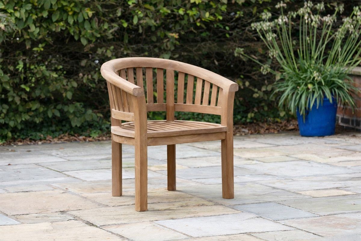 Constructed from sustainably sourced teak, this dining set offers exceptional durability and natural resistance to weather, moisture, and rot. The six banana chairs are designed for both comfort and longevity, complete with option for plush cushions (made in England) that could enhance the overall dining experience. Traditional mortise and tenon joinery ensures strength and stability, while the high oil content of teak helps maintain its beauty over time. Built for year-round outdoor use, this set combines timeless aesthetics with reliable performance, making it a long-term investment for any outdoor space.