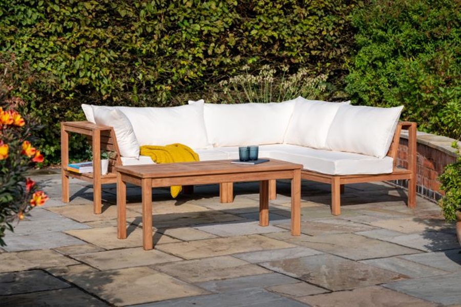 Edward Sloane (2024) Sherborne Teak Patio Lounge Furniture Corner Sofa Set. [online[ Available at: https://www.gardenbenches.com/wooden-garden-corner-sofa-sets [accessed 18/03/24]