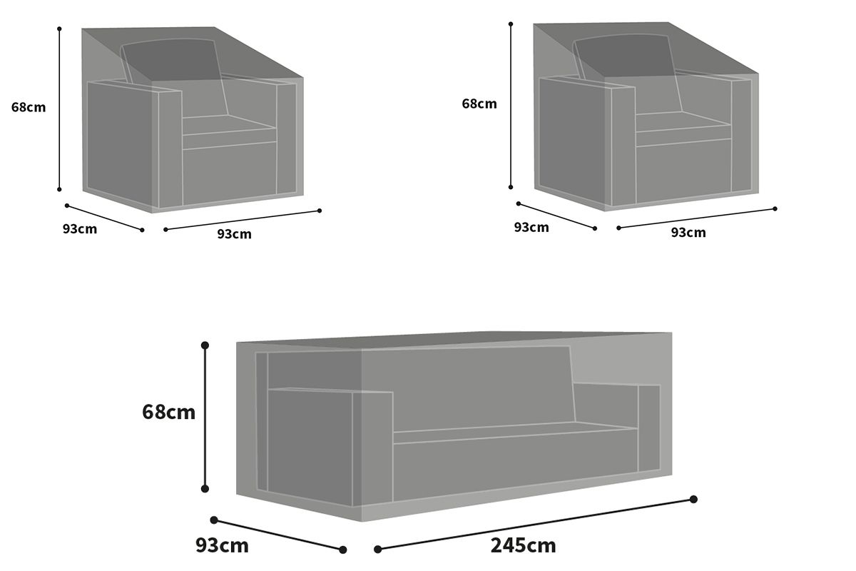 In summary, the Large Lounge Set Cover Pack in Charcoal offers comprehensive protection for your outdoor armchairs and three-seater sofa. Features such as air circulation vents, a secure strap and buckle system, UV stabilization, a water-repellent coating, reinforced eyelets with bungee ties, and premium polyester fabric work together to provide long-lasting durability and visual appeal, making it an essential addition to your outdoor living space.